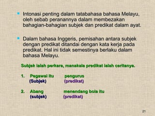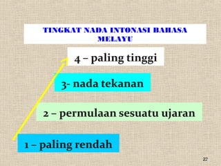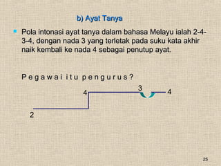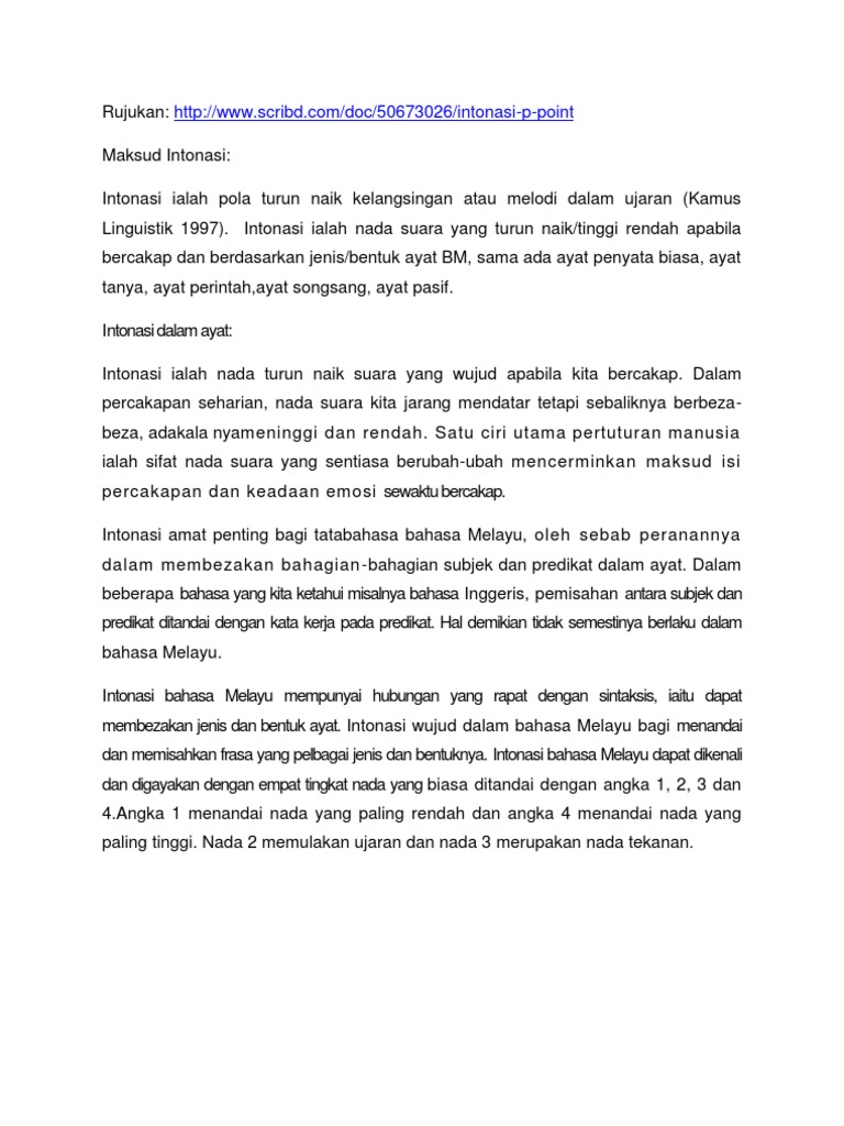 Alasan Bahasa Melayu menjadi bahasa Indonesia. Intonasi ayat dalam bahasa Melayu biasanya tidak sama dan berbeza-beza mengikut jenis ayat yang dituturkan. 3Bahasa baku yang betul tepat dan gramatis.